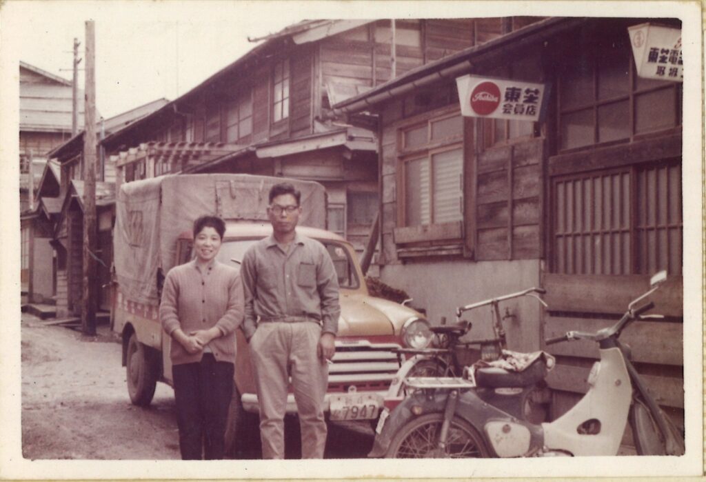 | 1957年 | 昭和32年7月 | 村尾正次が「村尾電気商会」を創業![]() 会社設立当時の会社前での先代社長夫妻 |