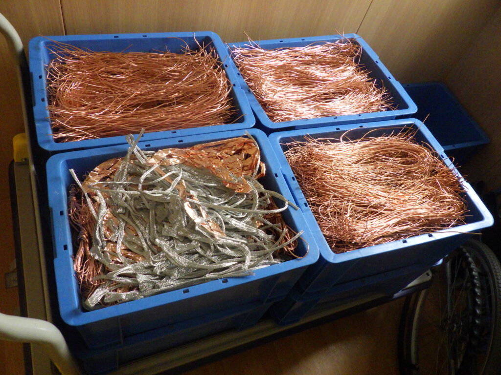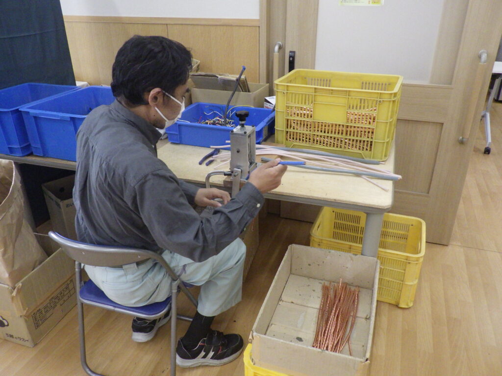 不要となった廃電線の被覆を剥ぎ取り、銅線を取出していました。