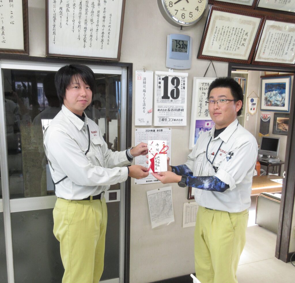 合格のお祝として専務より報奨金が授与されました。