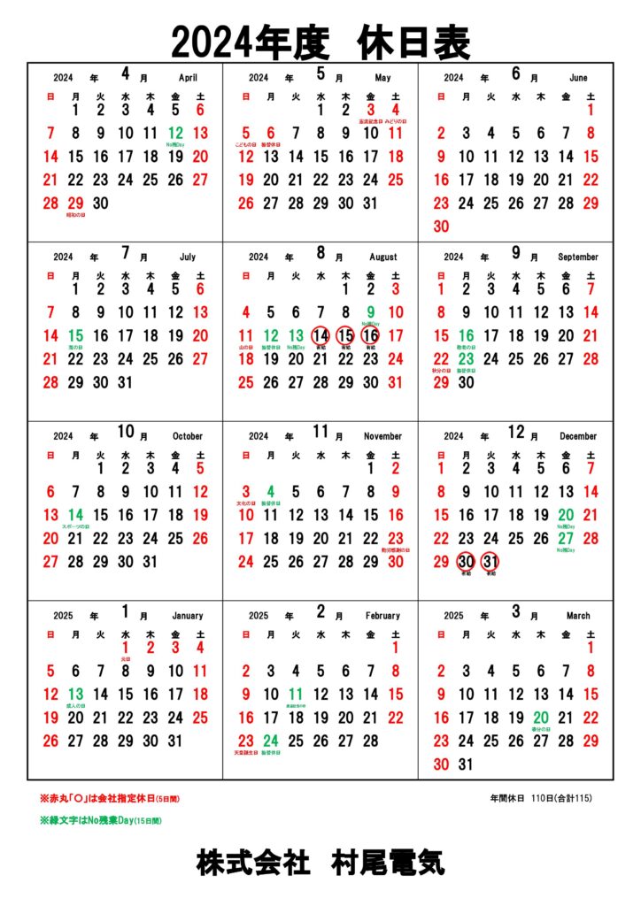 2024年度の休日表 2024 6/10 令和6年度2024年度休日表:HP用 株式会社村尾電気の動画を作成中です “踊るプロジェクト”最新作の撮影に協⼒しました。 関連記事 公式ウェブサイトをリニューアルしました。 2024年4月17日 花見イベントを行いました 2024年5月1日 株式会社村尾電気の動画を作成中です 2024年5月1日 動画upしました。 2024年6月14日 第一種電気工事士に合格‼ 2024年9月5日 “踊るプロジェクト”最新作の撮影に協⼒しました。 2024年10月11日 ㈱ネクスコ東日本エリアサポート様より表彰されました。 2024年10月15日 駅伝大会を応援しています。 2024年10月25日